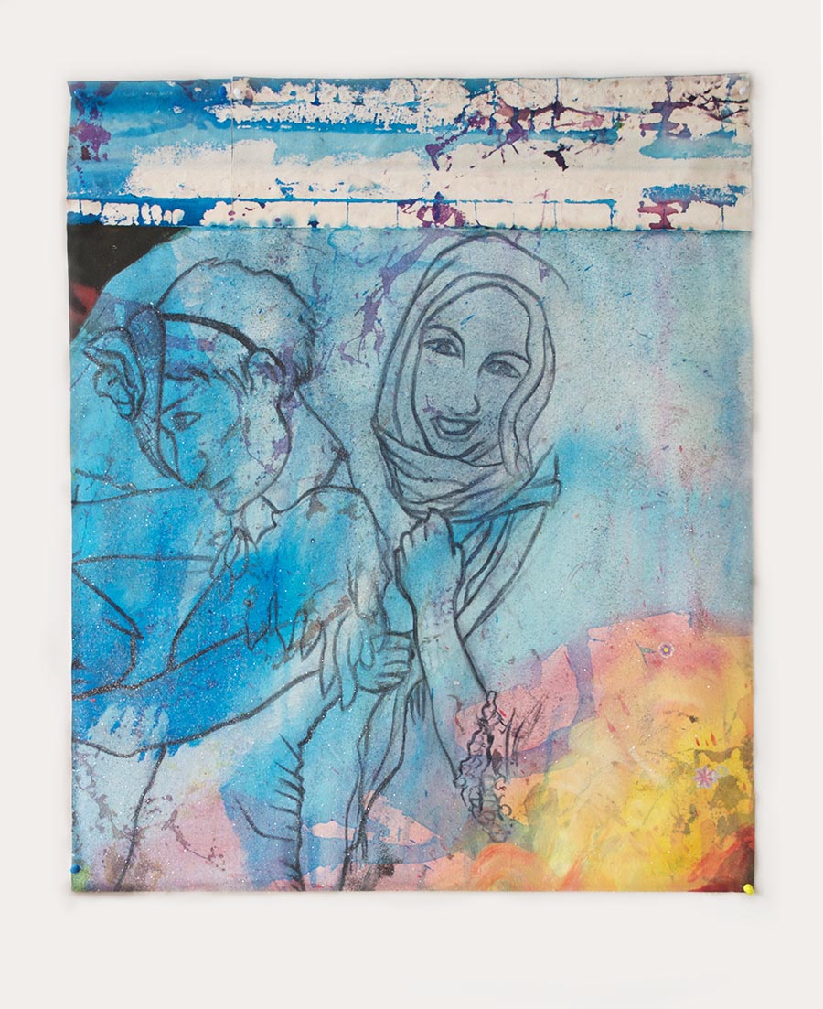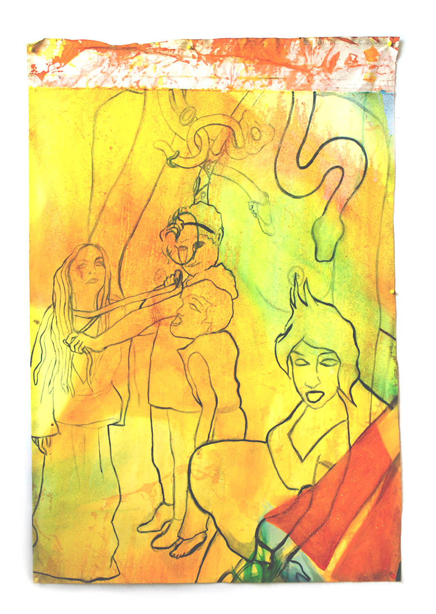 The series 'guerrilla jouissance' constructs group tableaux images of temporary euphoric kinships, depicting redemptively blissful communions, from orgiastic violence to ecstatic trance-states, in lurid colour scattered with glitter like broken glass and parties.